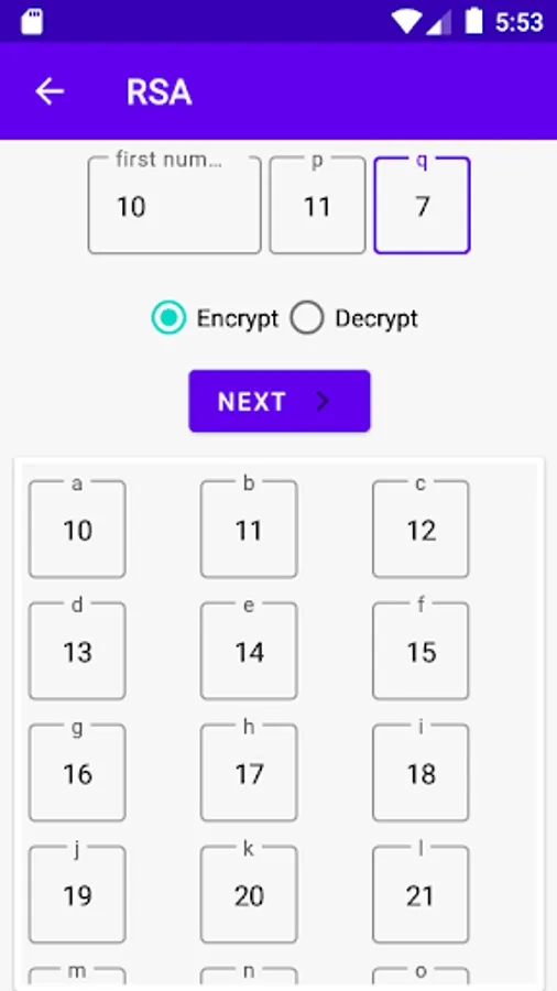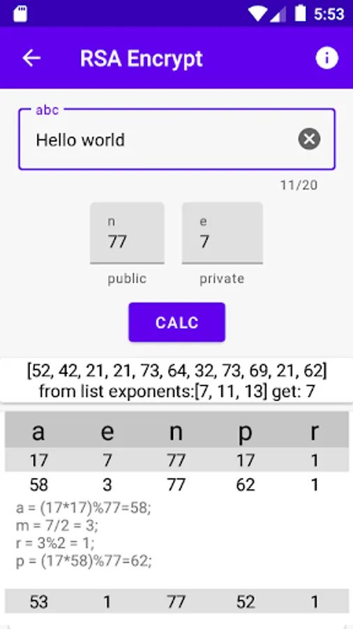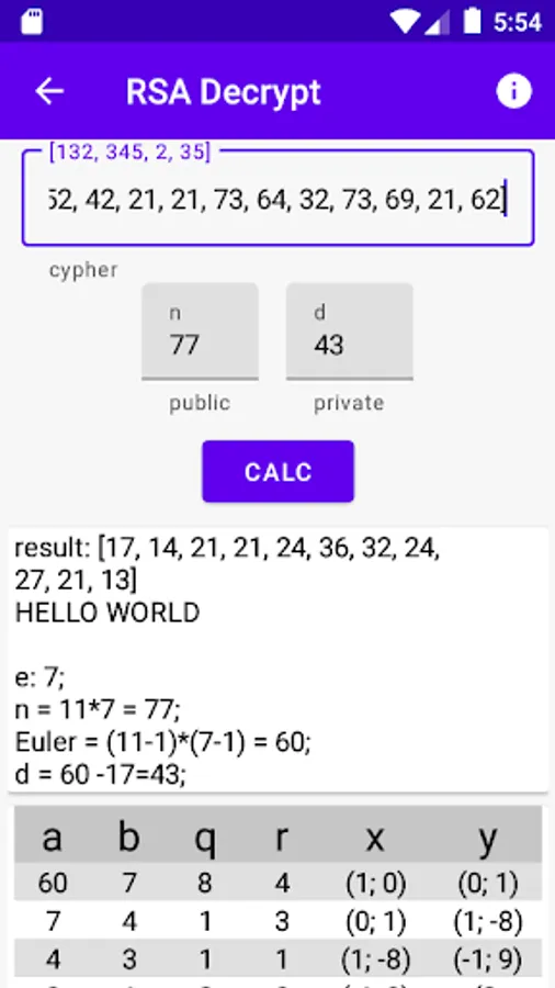 In the RSA algorithm, you can set your own values for the letters of the alphabet, encrypt and decrypt. The whole result is displayed as a small report, where you can see step by step how the word was encrypted and decrypted.