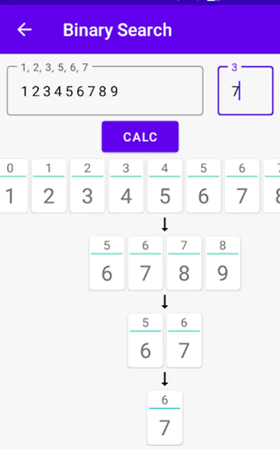 Binary search demonstrates how the algorithm works by visualizing looking up an element in the array you enter.