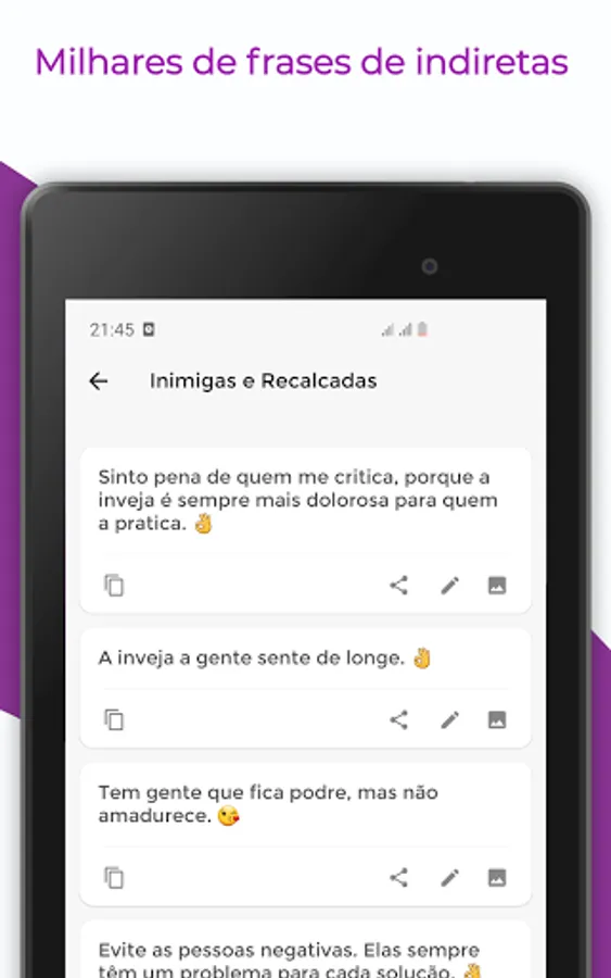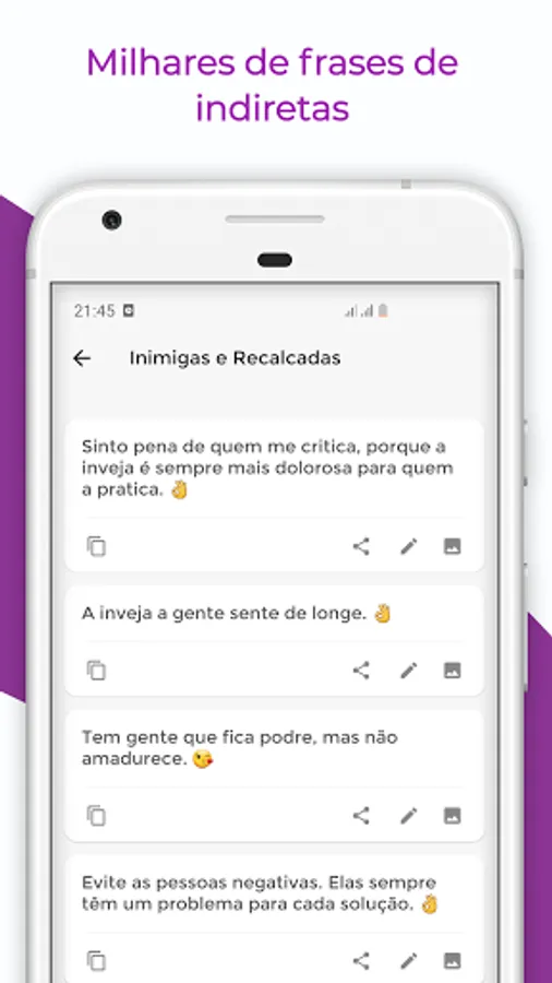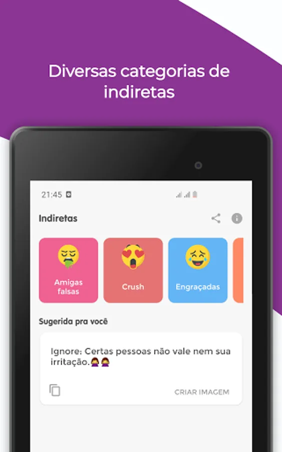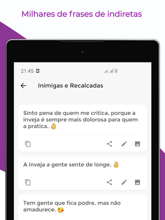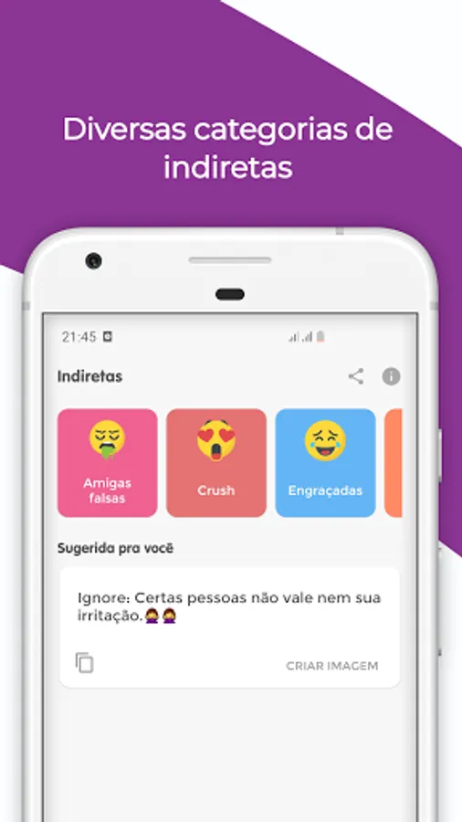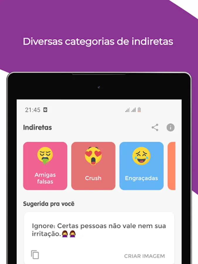 With Indirect phrases for status you will have the best heavy indirect phrases for all cases, with several options, for example, indirect phrases for fake people, ex, maloka, friend and more. This app is perfect for you who want to send a hint to prove that you're not stupid at all.