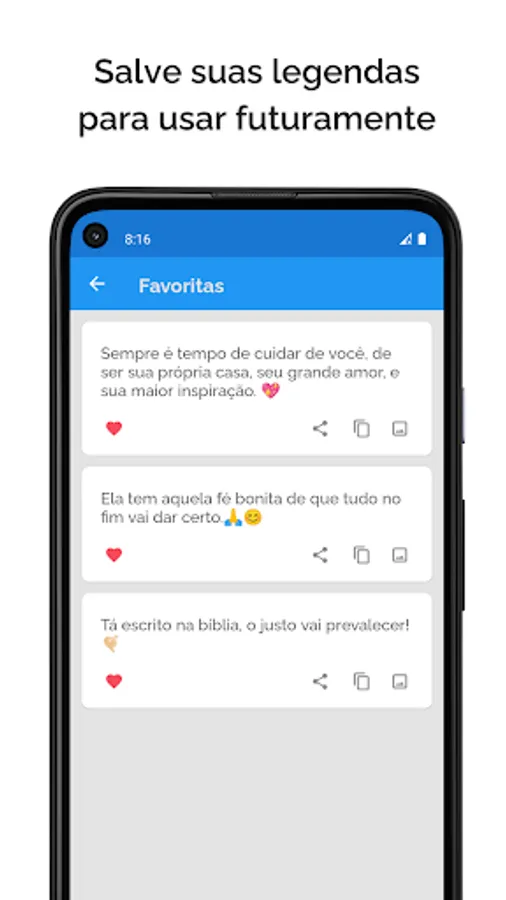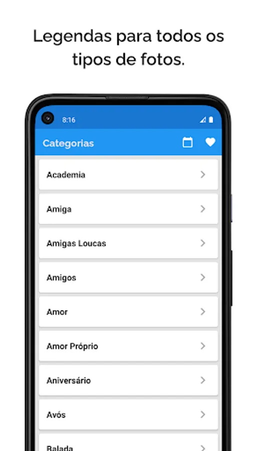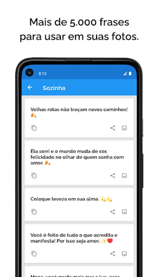 Take advantage of more than 5,000 photo phrases, carefully categorized into more than 50 thematic groups, to find the perfect caption for each photo. The app is intuitive, allowing you to easily copy texts and share them directly on social media platforms such as Instagram, Facebook and WhatsApp.