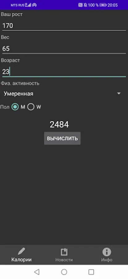 Calorie calculator - простое приложение для расчета калорий за сутки с учетом вашего роста, возраста, веса, пола и физической активности со встроенным новостным источником. Рачет калорий производится по формуле Миффлина - Сан Жеора для расчета суточной нормы калорий.
