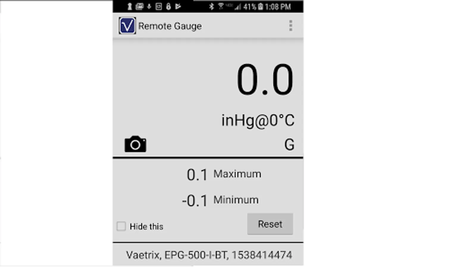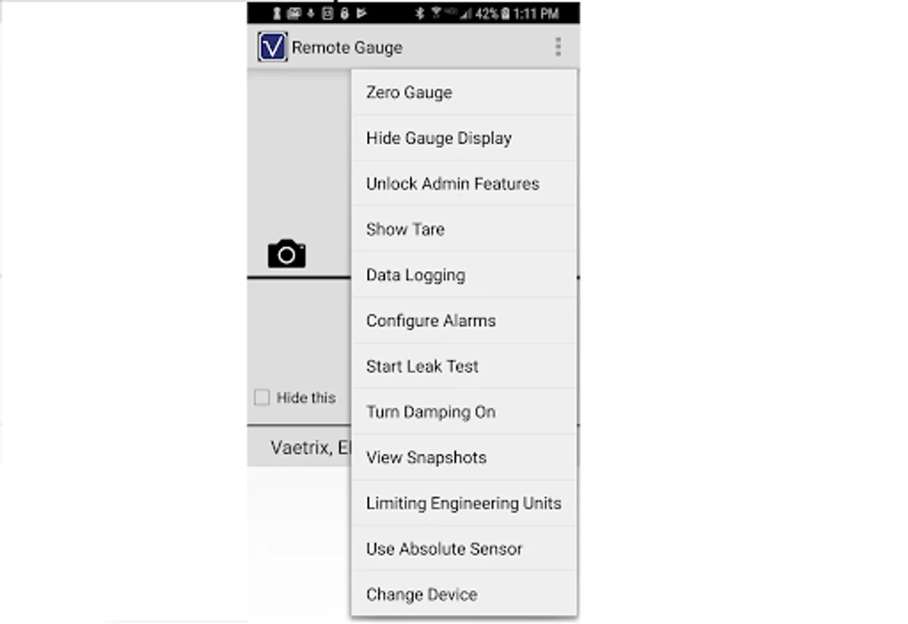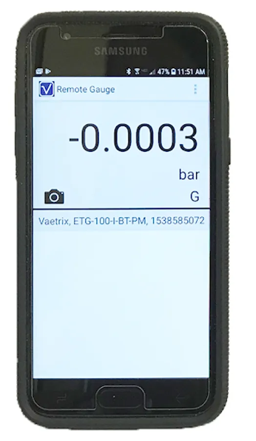 Vaetrix Remote Gauge is a free application designed to help you measure, troubleshoot, and calibrate process control equipment. View and analyze pressure trends remotely live on all Vaetrix ETG series gauges configured with Bluetooth communications. Set high and low pressure alarms so that can quickly identify and react to critical conditions. Monitor minimum, maximum, and live pressure readings simultaneously on one screen.