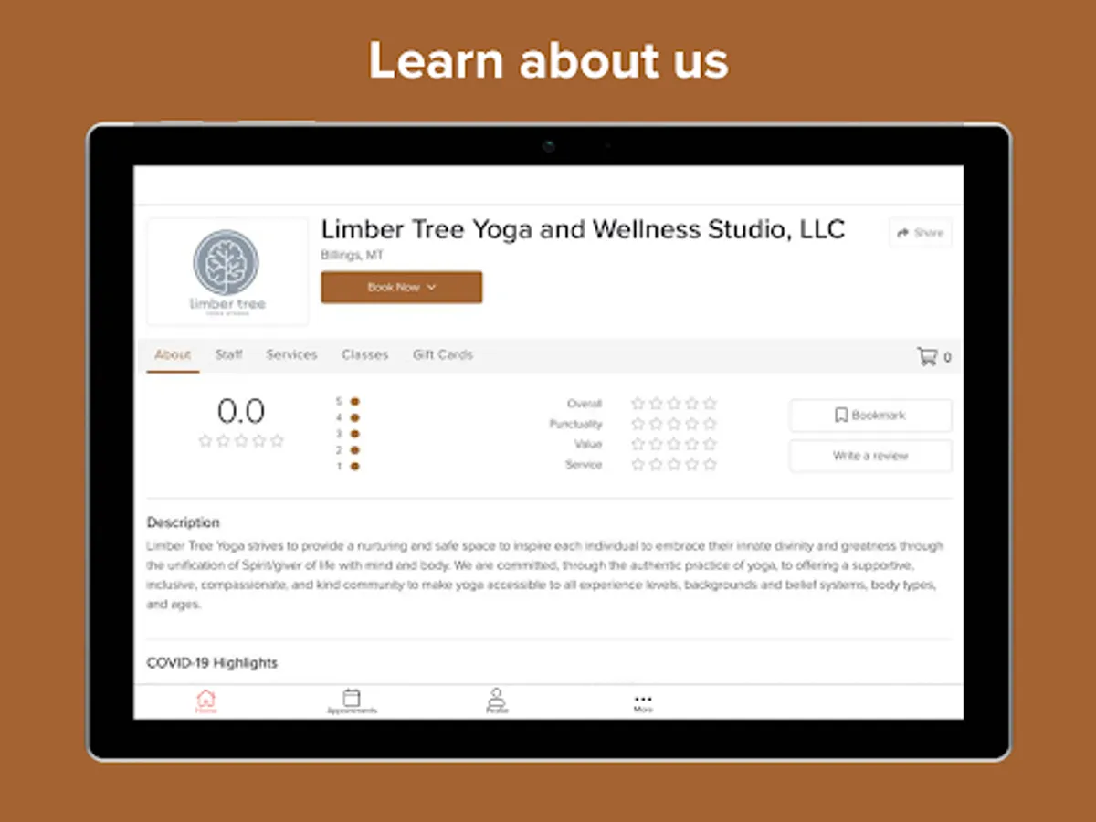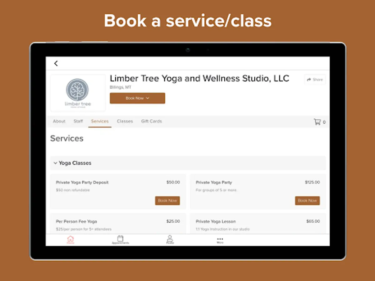With the Limber Tree Yoga and Wellness Studio, LLC mobile app, booking Yoga, Aerial and Pole Classes in the Billings, MT area is easier than ever!