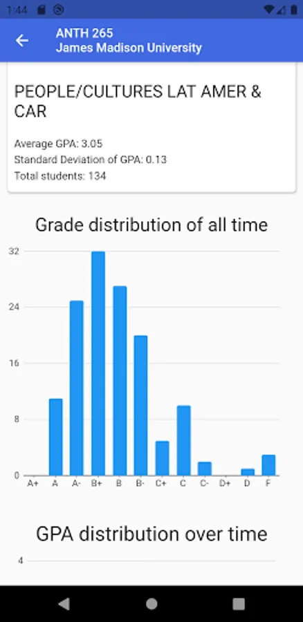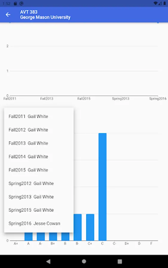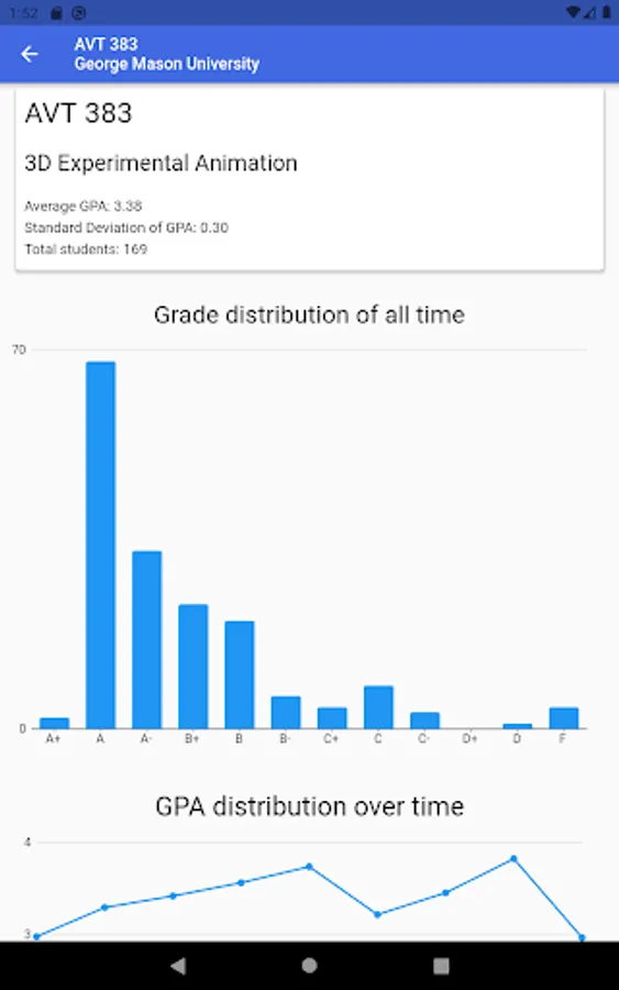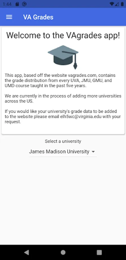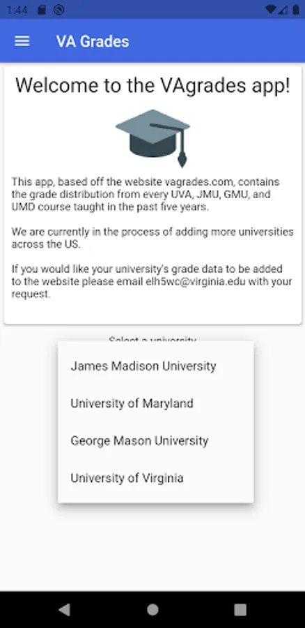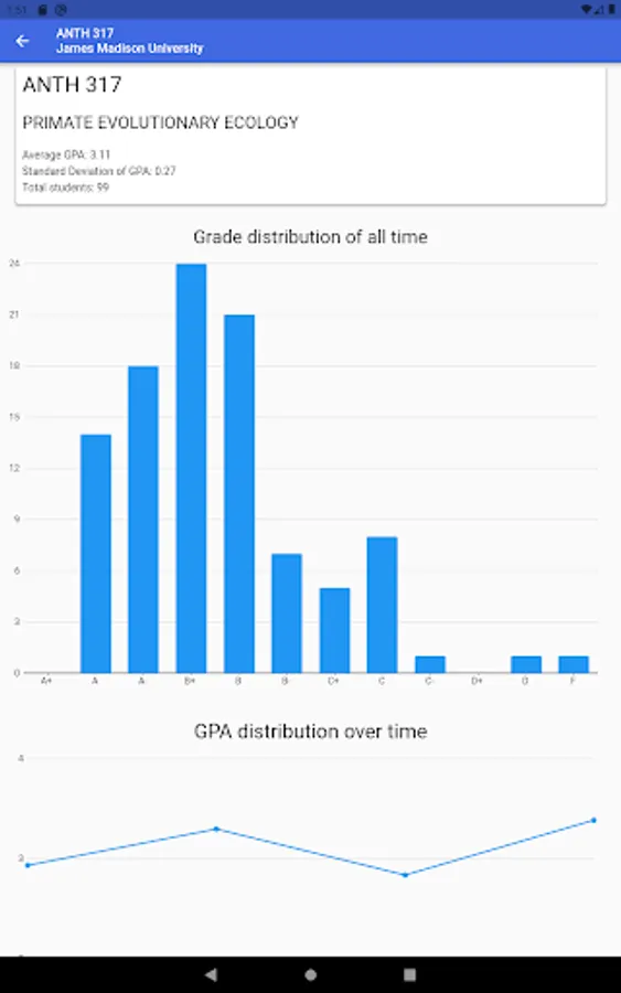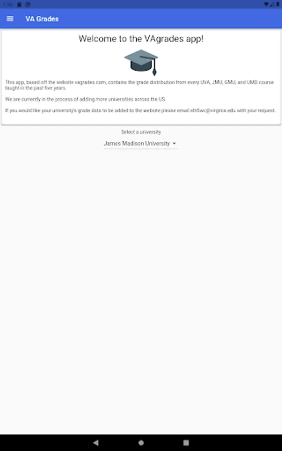 This app displays grade distribution from every UVA, JMU, GMU, and UMD course taught in the past five years. You can view any and every course and pick which sections to view as well as view all grade data for that course with this app.