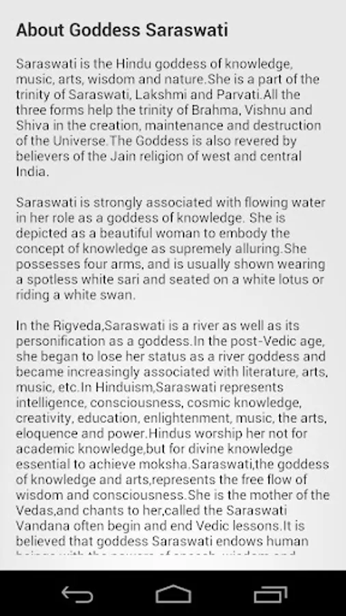 In the Rigveda,Saraswati is a river as well as its personification as a goddess.In the post-Vedic age,she began to lose her status as a river goddess and became increasingly associated with literature, arts, music, etc.In Hinduism,Saraswati represents intelligence, consciousness, cosmic knowledge, creativity, education, enlightenment, music, the arts, eloquence and power.Hindus worship her not for academic knowledge,but for divine knowledge essential to achieve moksha.Saraswati,the goddess of knowledge and arts,represents the free flow of wisdom and consciousness.She is the mother of the Vedas,and chants to her,called the Saraswati Vandana often begin and end Vedic lessons.It is believed that goddess Saraswati endows human beings with the powers of speech, wisdom and learning. She has four hands representing four aspects of human personality in learning: mind,intellect,alertness and ego.She has sacred scriptures in one hand and a lotus – the symbol of true knowledge – in the second.With her other two hands she plays the music of love and life on a string instrument called the veena.She is dressed in white – the symbol of purity – and rides on a white swan – symbolizing Sattwa Guna or purity and discrimination.The learned and the erudite attach greater importance to the worship of goddess Saraswati.Saraswati's birthday is on Vasant Panchami its a Hindu festival celebrated every year on the 5th day of the bright fortnight of the lunar month of Magha.