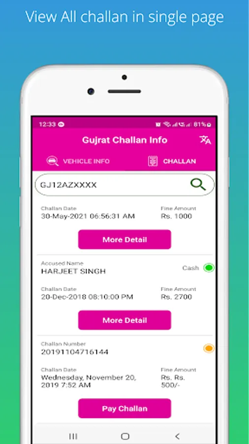 Get Challan/ eChallan/ Chalan status against any vehicle RC or DL before buying it.