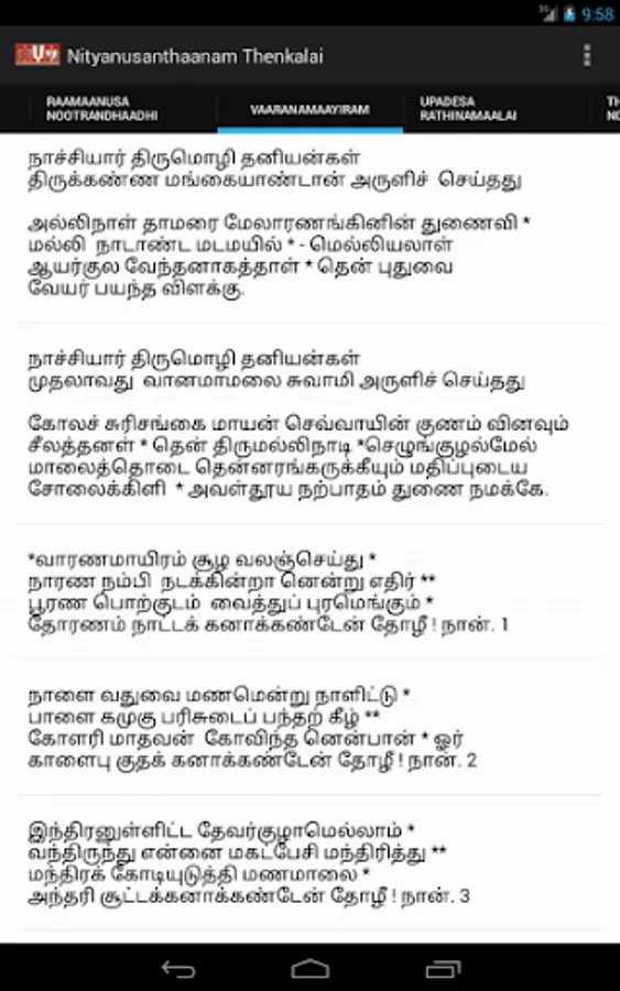 Collection of paasurams from Naalaayira Divyaprabandham that needs to be recited at home during daily Thiruvaaraadhanam. This collection of paasurams is named Nityanusanthaanam. These set of paasurams are generally recited by Thenkalai sampradhayam.