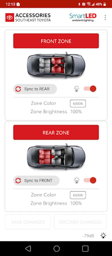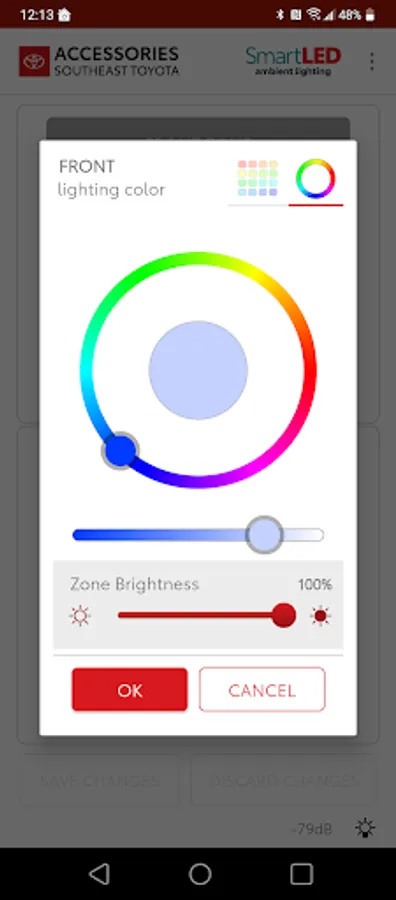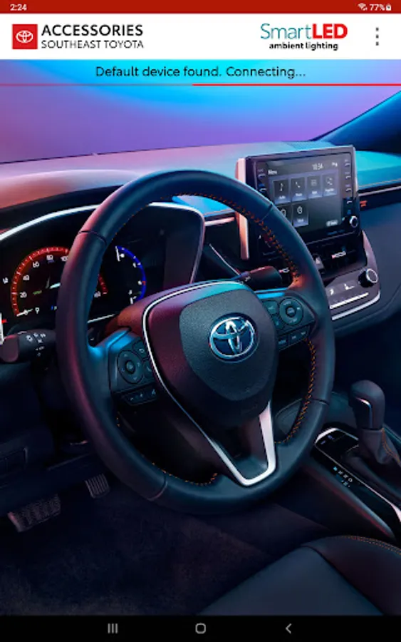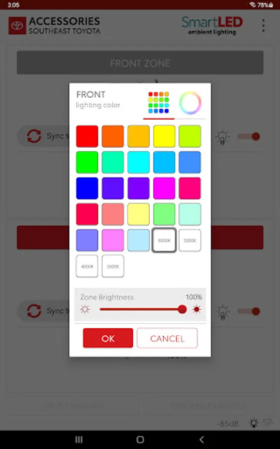 SmartLED is an essential tool to go along with Ambient Lighting product from SOUTHEAST TOYOTA ACCESSORIES. SmartLED is designed to allow users to select any color using a color wheel or preset swatches, as well as select desired brightness. Selections may be done for front and rear zones separately or synced together.