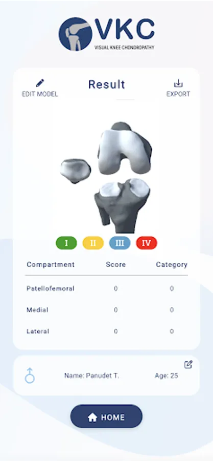 VKC-Visual Knee Chondropathy app lets you locate the chondral lesions and calculates the knee chondropathy for you based on the arthroscopic cartilage lesions score and category of SFA or the French Association of Arthroscopy. [Dougados M, Ayral X, Listrat V, Gueguen A, Bahuaud J, Beaufils P, Beguin JA, Bonvarlet JP, Boyer T, Coudane H, et al. The SFA system for assessing articular cartilage lesions at arthroscopy of the knee. Arthroscopy. 1994 Feb;10(1):69-77.] This app makes the SFA score more convenient to use as an evaluation tool of the knee chondropathy for patellofemoral, medial and lateral compartments of the knee joint by simply grading and locating the cartilage lesions. on the interactive 3D knee model.