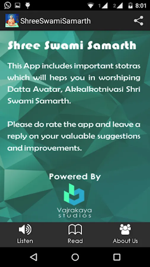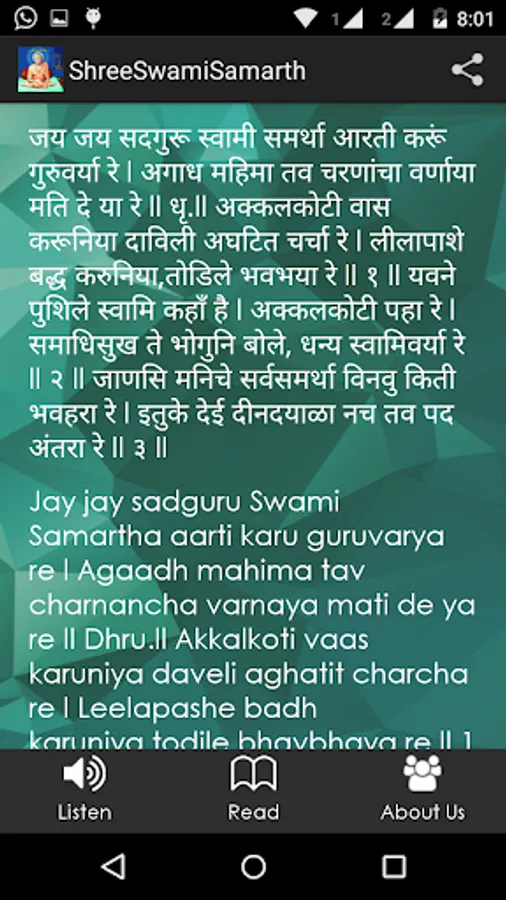This App includes important stotras which will heps you in worshiping Datta Avatar, Akkalkotnivasi Shri Swami Samarth. What are you waiting for, go ahead and download the app and get yourself involved in Shri Swami Samarth parayan and get blessings. Please do rate the app and leave a reply on your valuable suggestions and improvements.