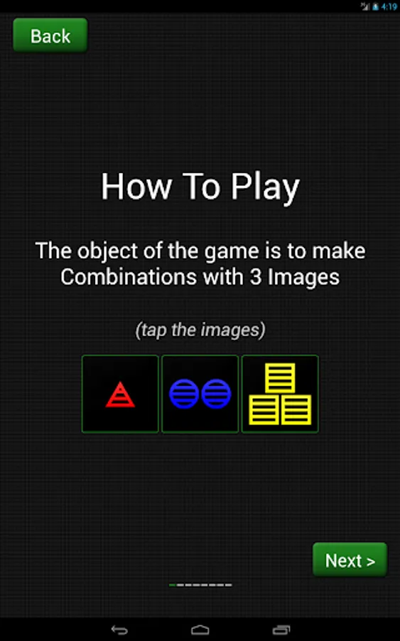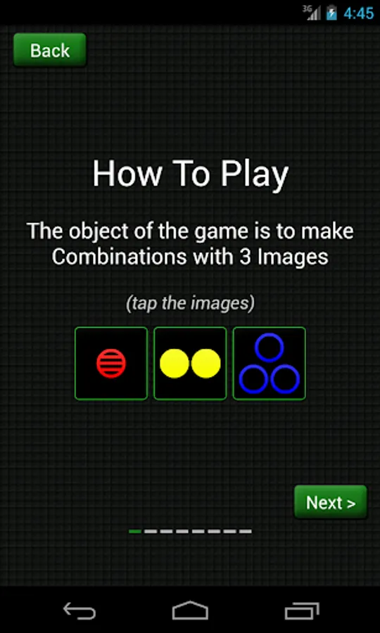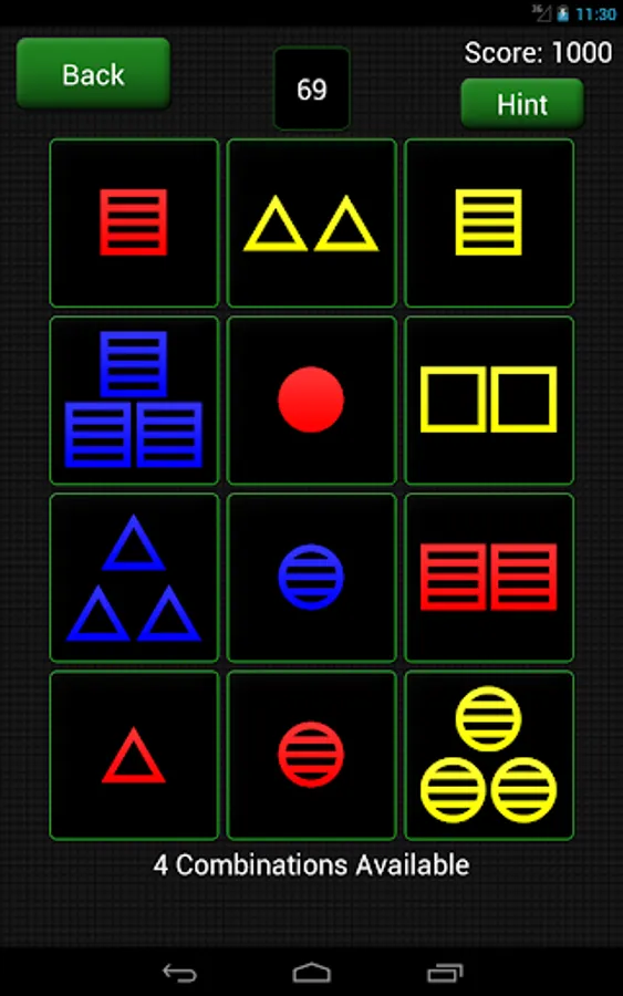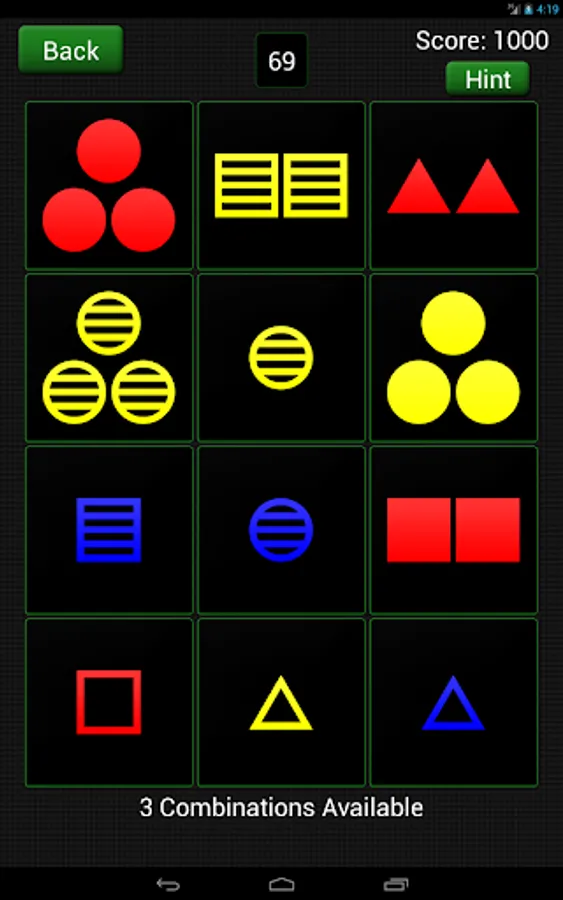 Find a set of 3 images to make a Combination. These 3 image sets must have each of their 4 attributes (Color, Shape, Fill, Count) all the same or all different. Get ready to have fun playing this game while helping your brain at the same time.