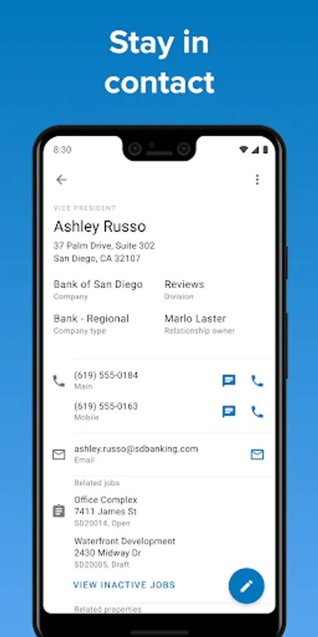 All of your clients, contacts and staff can be reached right from the app. Make a phone call, send a message or write an email, all with one touch.