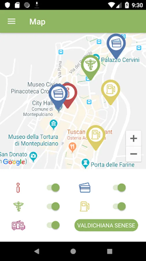 - map of the Valdichiana: with 10 towns, Montepulciano, Pienza, Chianciano Terme, Chiusi, Sinalunga, San Casciano dei Bagni, Sarteano, Trequanda, Torrita di Siena and Cetona. For each town are indicated: tourist information office, pharmacies, parking areas for campers, ATM points and service stations.