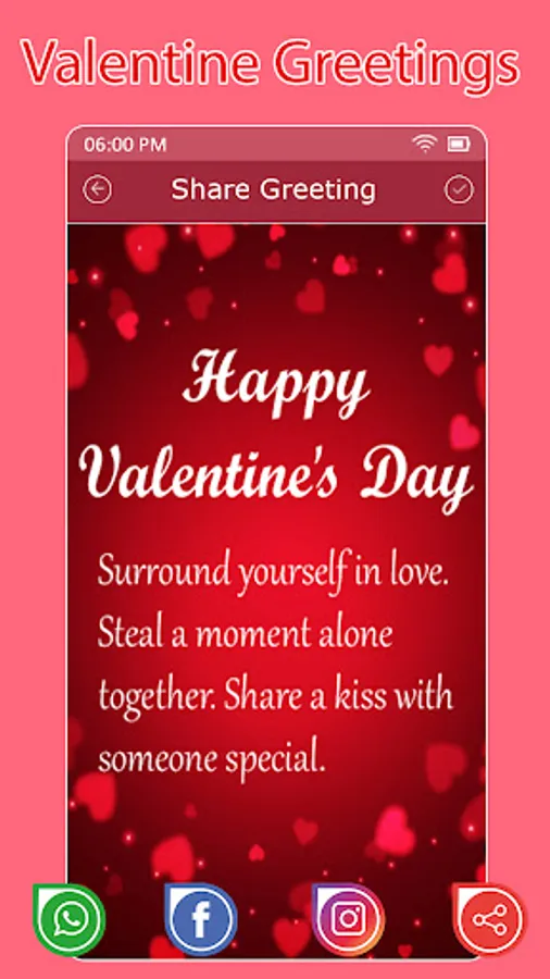 You can share Happy Valentine day Wallpaper,Valentine greeting cards,Valentine Greetings Maker or messages with friends and family on social apps.