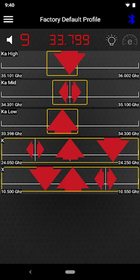 Radar coverage can now be specially tailored to the unique radar bands used outside the U.S. Advanced users may want to tailor the sweeps covering frequencies used here in the U.S. according to unique local conditions. The Profiles screen shows a menu of the variables you can modify.