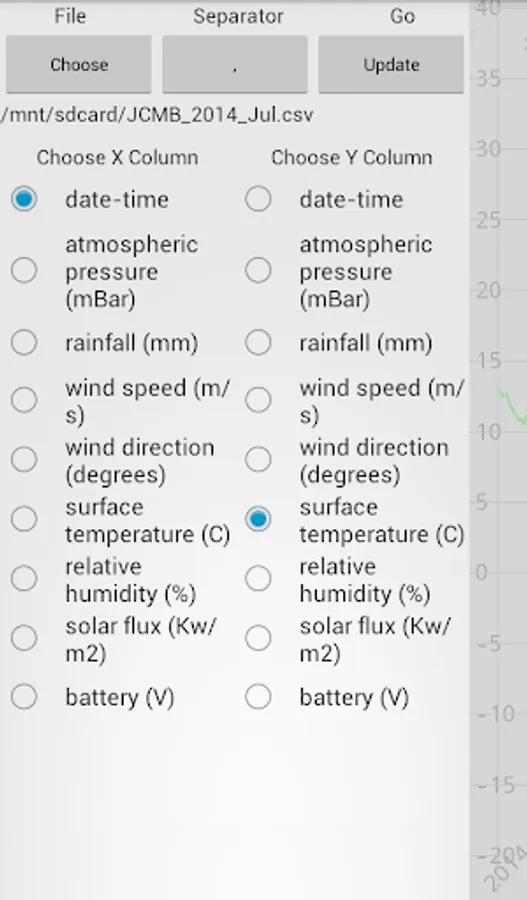 Graph 2 columns in a CSV file. You can pick 2 columns, one for x, and the other for y to graph.