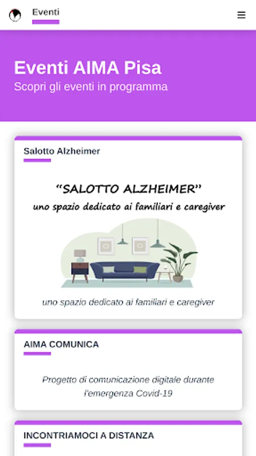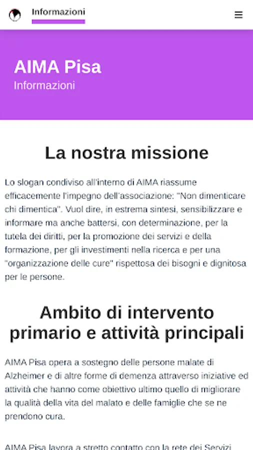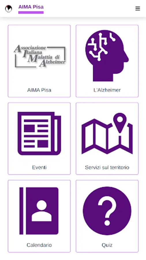The AIMA Pisa section association has developed the "AIMA Pisa App" to provide an additional tool that is easy to consult and use that adds an important piece to the complex but necessary path of information and support. In fact, within the "AIMA Pisa App" the family member can find useful information on the disease, on its management of daily problems and on local services. In addition, the app provides a personal calendar in which you can enter the therapies, appointments and notes related to the symptoms, also useful in order to trace a clinical evolution to report to your doctor. Through "AIMA Pisa App" it is possible to stay informed about events and news about Alzheimer's disease and find out what we really know about the disease through the quiz "True or false?" within the app.
