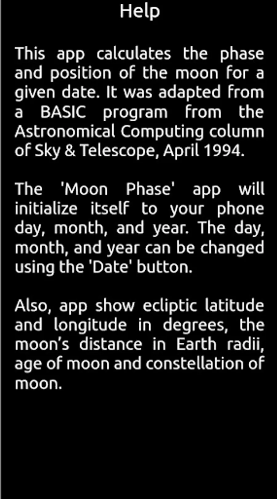 The Moon Phase app calculates the phase and position of the moon for a given date. It was adapted from a BASIC program from the Astronomical Computing column of Sky & Telescope, April 1994.