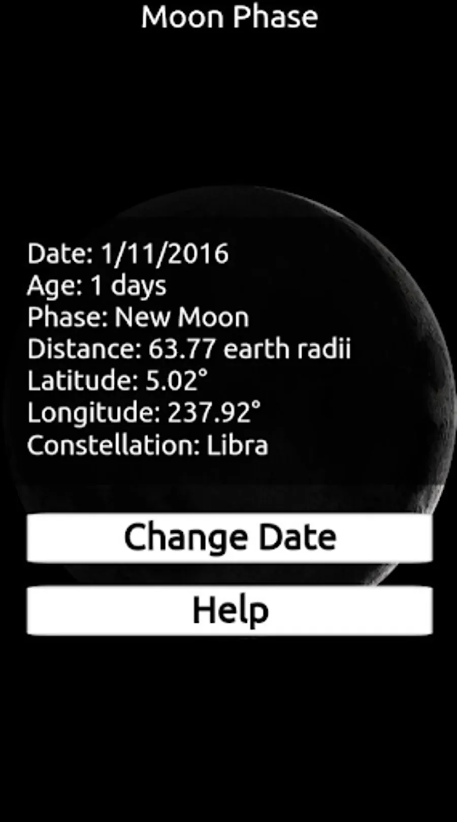 Also, app show ecliptic latitude and longitude in degrees, the moon’s distance in Earth radii, age of moon and constellation of moon.