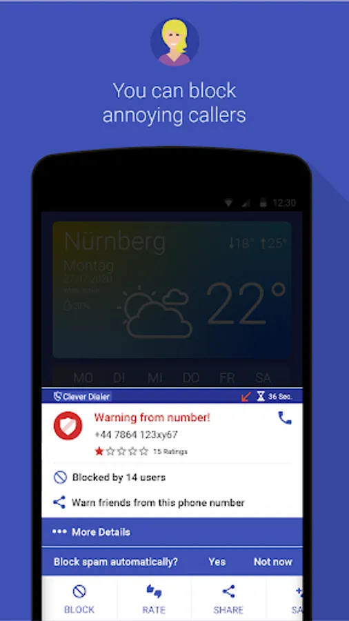 With Clever Dialer spam callers don't stand a chance. Incoming calls are being checked against our extensive spam caller database. The Clever Dialer community helps us staying on top of things. Every user can report spam calls, so even numbers that spam only very recently are included.