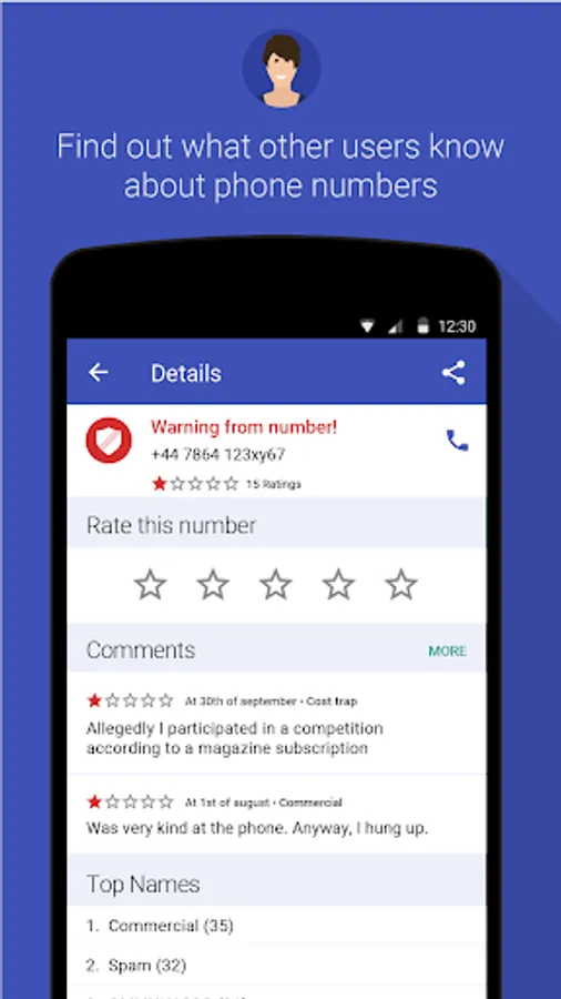 ★ identify spam callers: warns against cost traps and other annoying spam calls