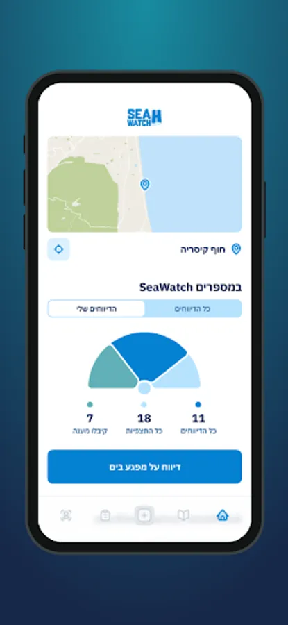 SeaWatch is a center for handling public reports about ecological risks in the Mediterranean Sea and the Gulf of Eilat. The center is operated by the team of the Society for the Protection of Nature, and its goal is to improve the ecological condition of the Mediterranean Sea and the Gulf of Eilat and allow the public to be directly involved in saving the sea.