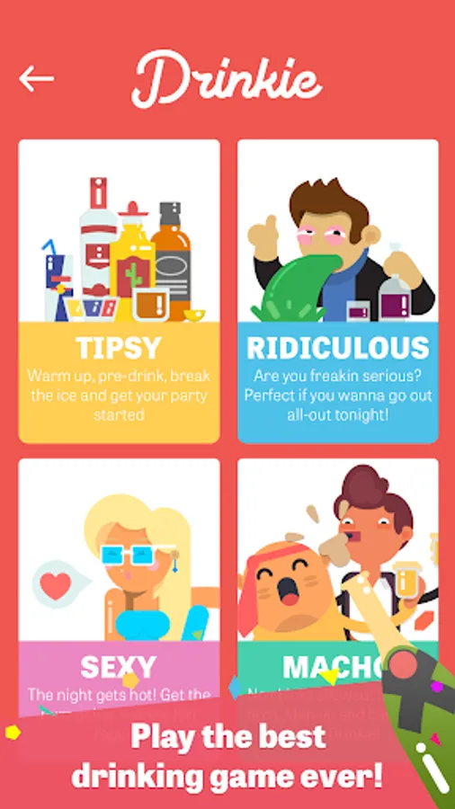 - Tipsy. The main neutral category fits everybody. Perfect for pre-drinking and for crazy house parties, housewarmings, birthday parties or any other occasion.