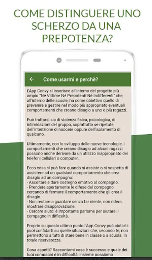Thanks to the explanatory text present and always available within the App, it is possible to deal with the topic within one's family in a constructive way, learn to recognize the behaviors that can prevent a peaceful coexistence within the school (or re-enter in the category of bullying or cyberbullying) and identify the most correct behaviors to take once these situations are recognized.