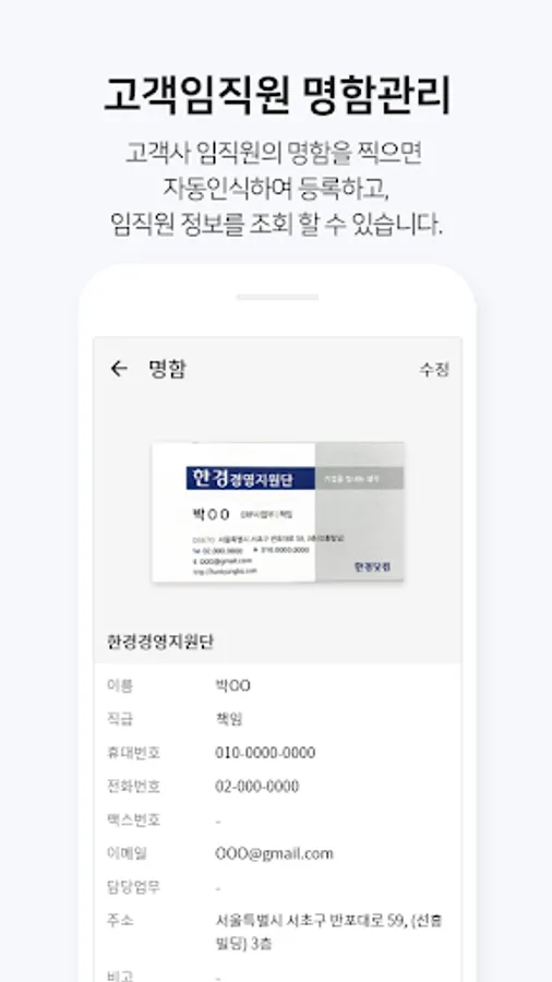 5. You can register and search business card images and employee information of the customer's employees. When you take a business card, the text is automatically recognized and saved.