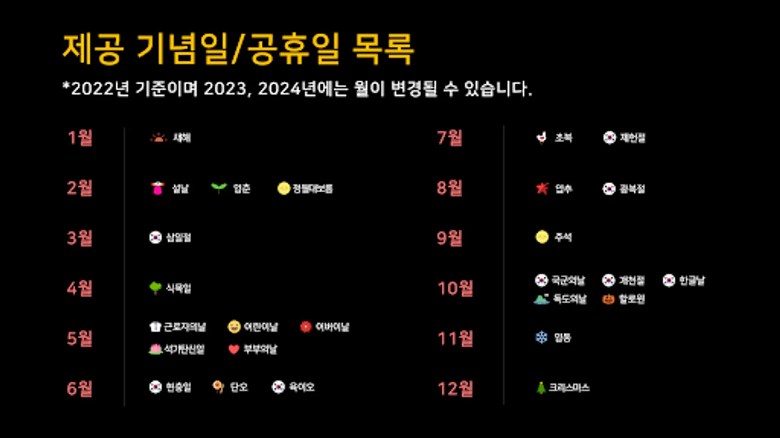 - 공휴일, 기념일 알림 *상세내용은 스크린샷 참조