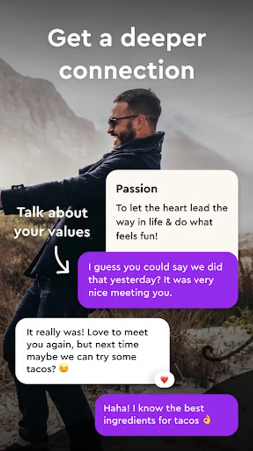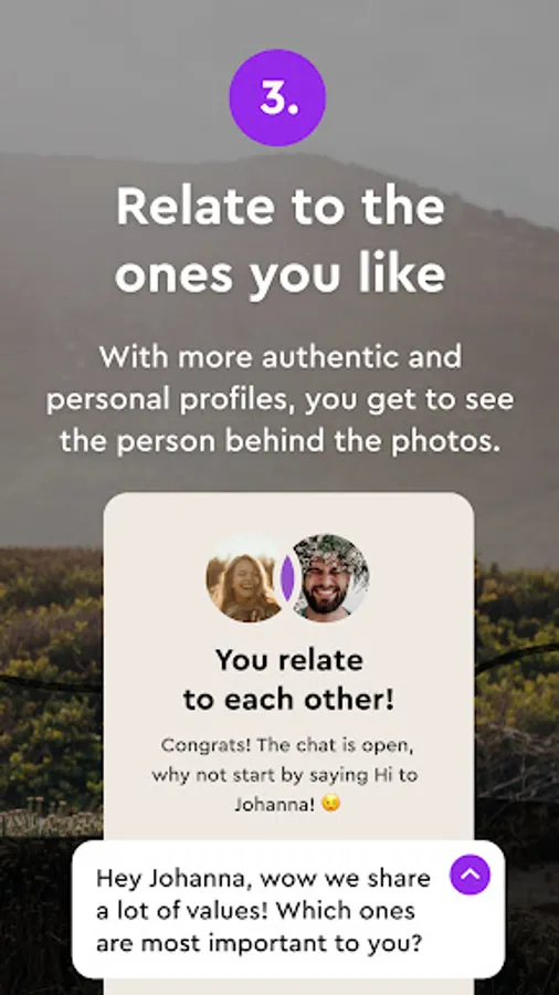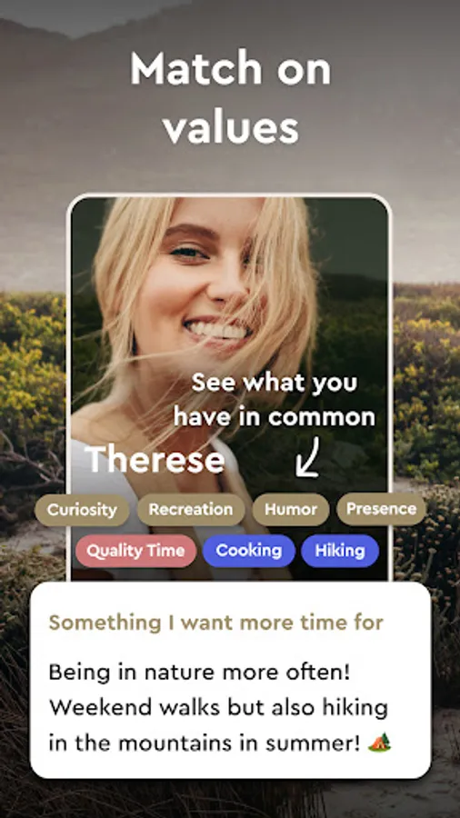 Ask about or comment on each other's values or photos to get a strong connection right away. Discover how conversations around values not only help you evaluate your compatibility but also help you grow as a person by giving you new perspectives on what’s important in life and how you want to live.