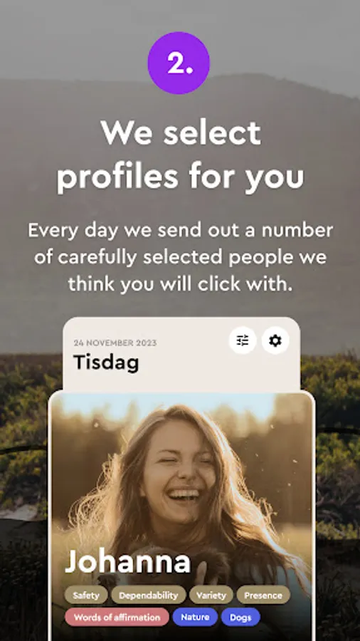 Based on your preferences and values we will send out 10 new selected profiles everyday, to avoid you having to sit and swipe for yourself. If you find someone you like, you press “relate”. When the interest is mutual, a match occurs and a chat will appear.