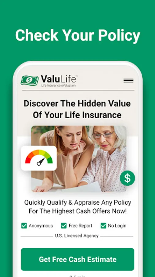 Discover the unknown value of your life insurance policy with ValuLife™, a life settlement calculator for cash estimates in seconds!