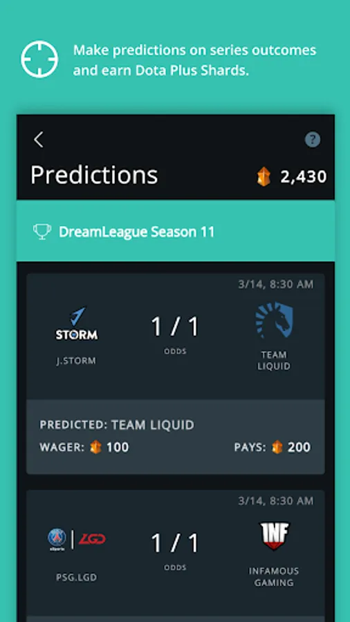 PREDICTIONS: Flex your powers of prognostication and make predictions on upcoming DPC matches no matter where you are. In addition to the customary bragging rights, Dota Plus Shards await you for correct calls.