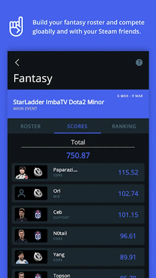 FANTASY CHALLENGE: Don't just watch the DPC, field your own team of champions in the Fantasy Challenge. Build your roster and compete against your friends and the entire world to score the most points. You'll earn Shards based on how well you stack up.