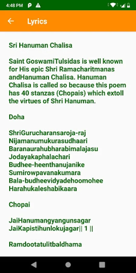 Hanuman Chalisa - A poem contains 40 stanzas (Chopais) which extoll the virtues of Shri Hanuman.