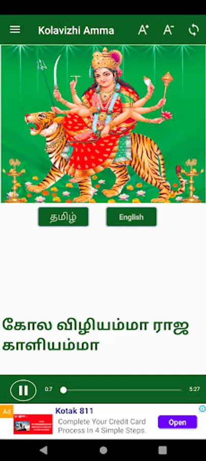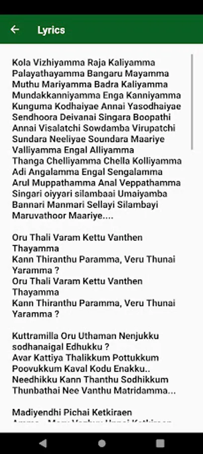 எங்கள் கோலவிழி அம்மனே நாங்கள் வணங்கும் ராஜ காளியம்மனே எங்களுக்காக யுத்தம் செய்யும் பாளையத்துத் தாயே அம்மனே பங்காரு மாயம்மா நாங்கள் வழிப்படும் முத்து மாரியம்மா பத்ரகாளியம்மா