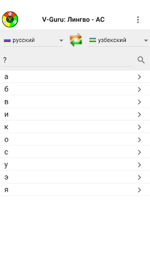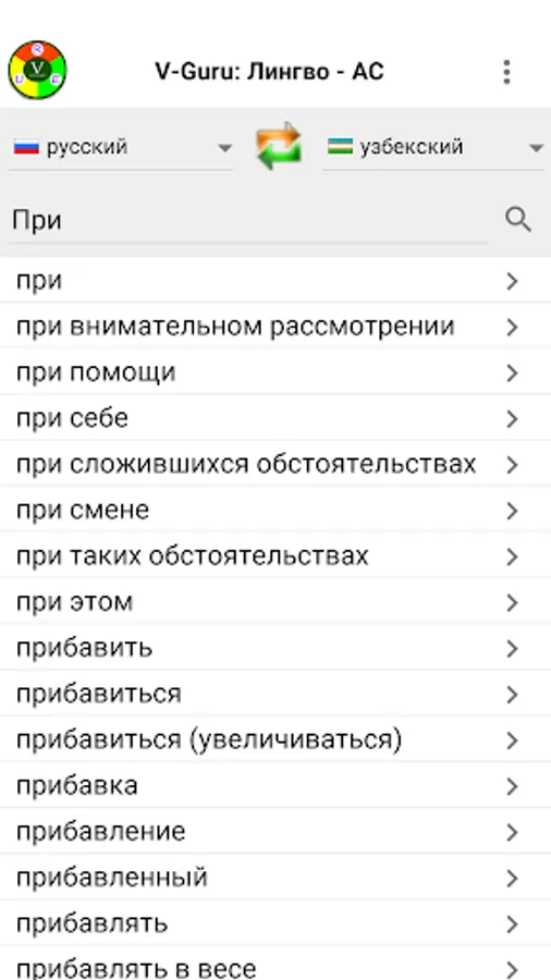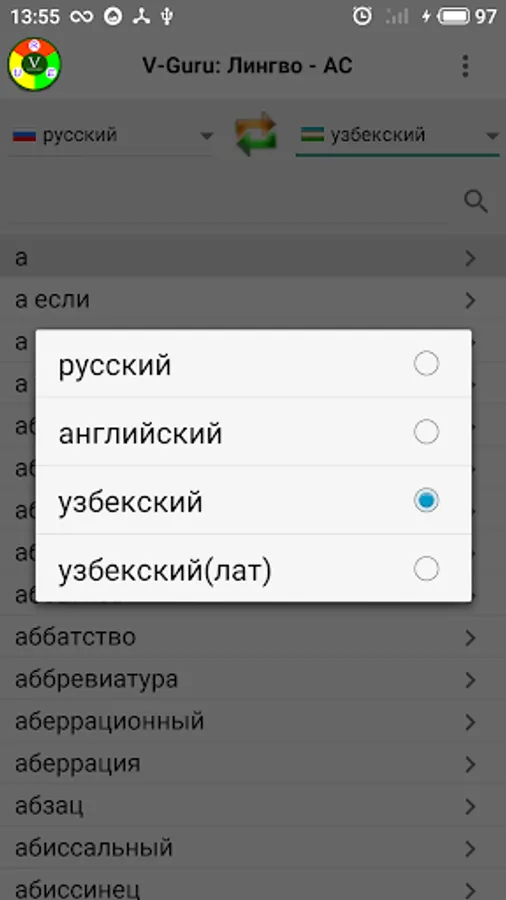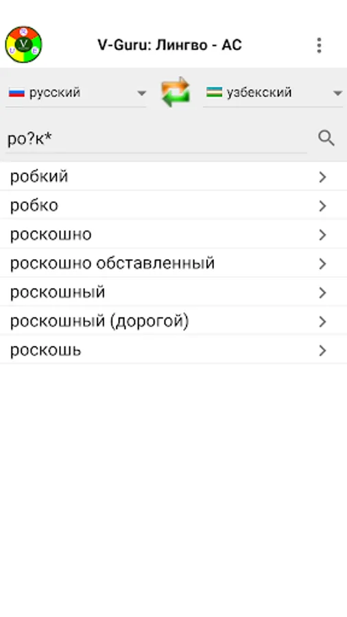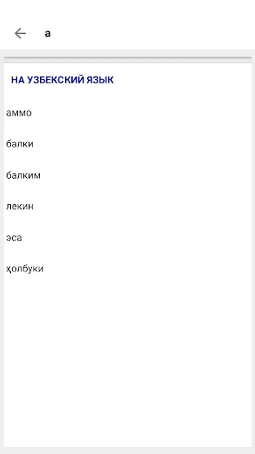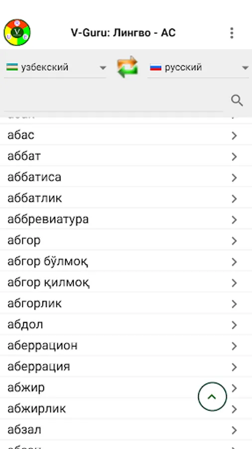 Electronic Russian-English-Uzbek dictionary with more than 50,000 words for each of these languages. Allows you to receive off-line online translations in any direction between Russian, English and Uzbek (both Latin and Cyrillic) languages.
