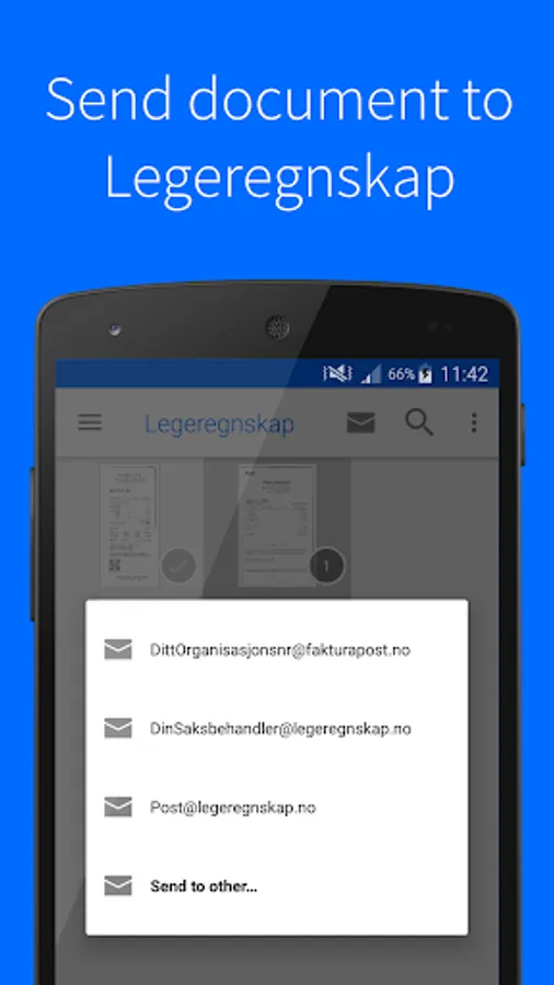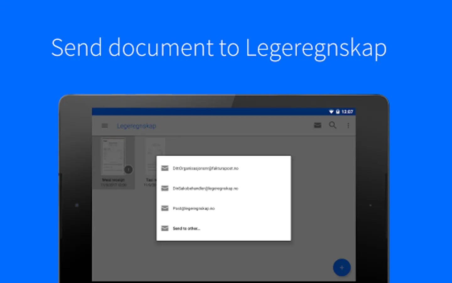 - Easily send your bills and receipts to the appropriate e-mail address within the Legeregnskap company.