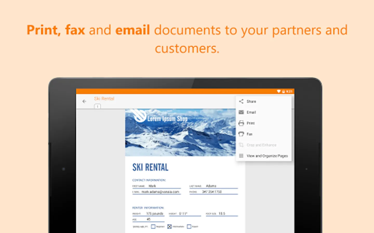 - Print, fax and email documents to your partners and customers.
