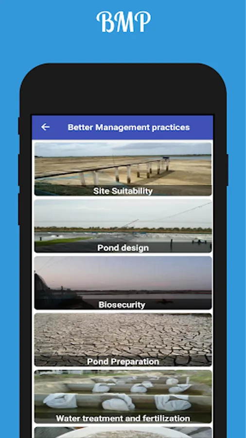 Better Management Practices (BMPs) of shrimp farming which includes site selection, pond design, pond preparation, seed selection and stocking, feeding and feed management, soil and water quality management, health management, farming regulations, food safety and record keeping which are briefly explained with illustrations.