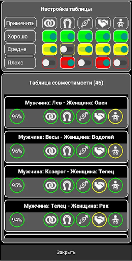 The application compatibility table will help you choose the optimal unions on a scale of "Good-Medium-Bad", get the percentage of pair compatibility.