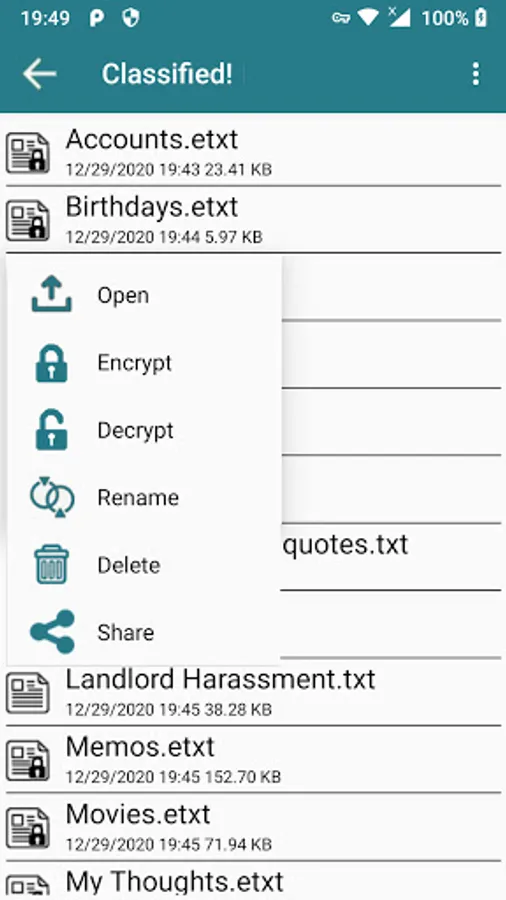 Did you know that it can be a lot easier for malware to end up on your mobile phone or tablet than on your computer? Access to mobile phones and computers can be password protected, but what if someone reveals the password, or manages to remove it? In such a horrible scenario, all documents and files you create on your device are visible to anyone. Classified! is an application designed to help you keep your privacy, keep your login data, and your files for your eyes only.