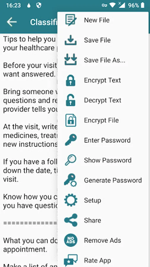 All the files you select to protect, and all the text you type are encrypted with powerful encrypting algorithms against which there are no successful attacks. This guarantee that your data will remain only yours. This means that nobody can read it, or see it any text you wrote in Classified!, or any file you encrypt without correct password and Classified! app.