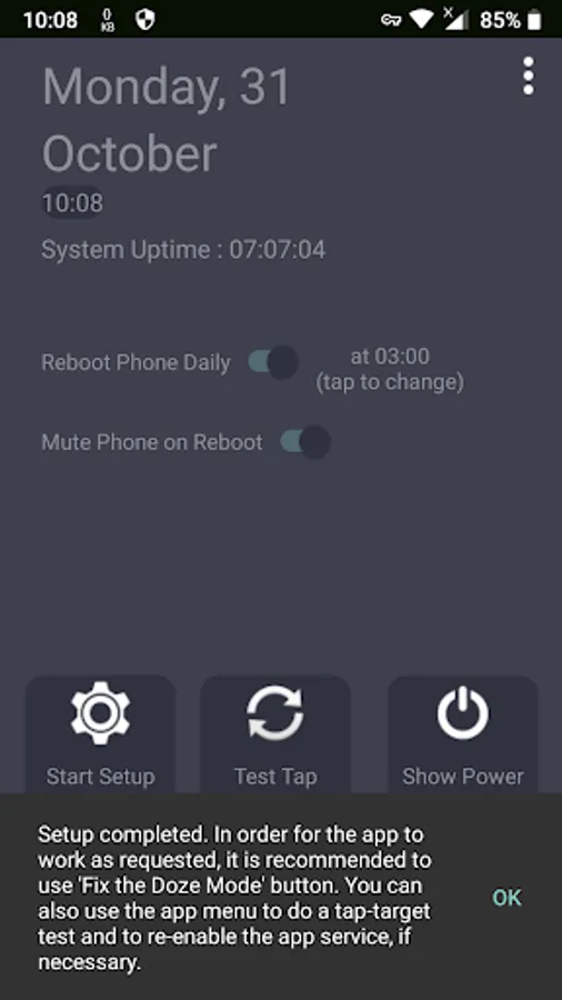 Note: In order for the app to work as requested, maybe on some phone models screen lock needs to be disabled (for example, before going to sleep user should disable screen lock if the app was set to reboot the phone during the night)