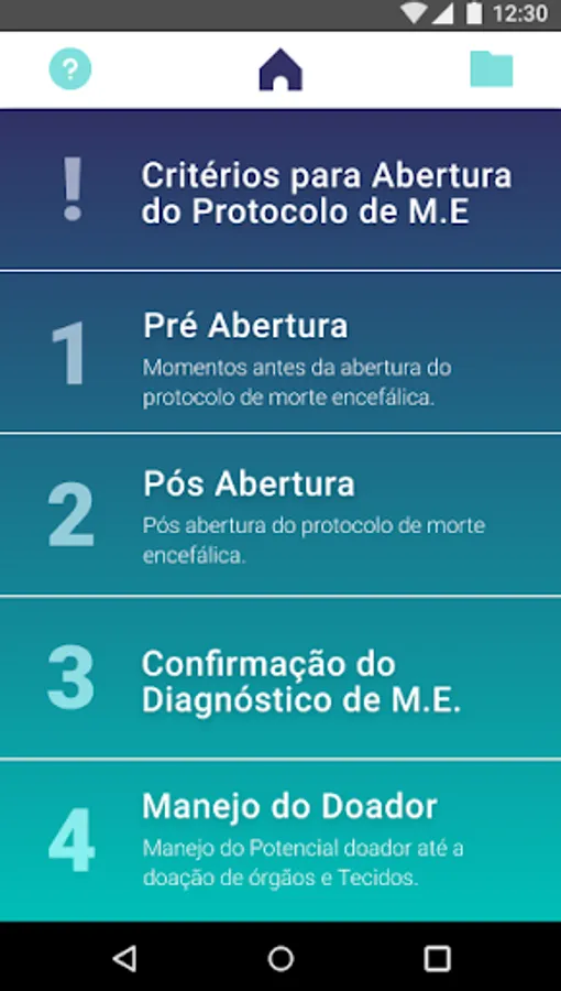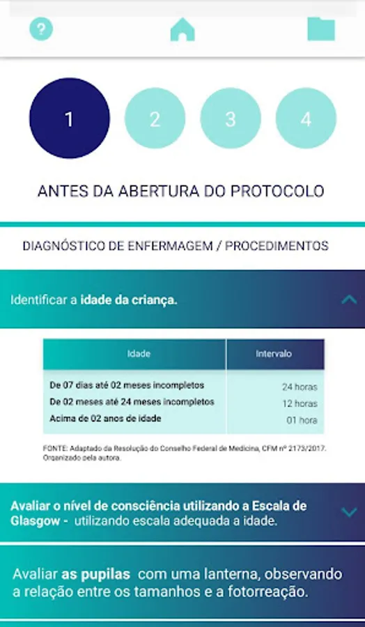DOA PEDI - This app aims to: Guide the nurse to identify pathophysiological changes and choose the conducts for safe management of a child suspected of brain death, aiming to maintain the viability of organs and tissues for transplantation. It is an educational care technology. It consists of 5 Blocks, one with the criteria for opening the brain death protocol, according to Resolution of the Federal Council of Medicine, CFM nº 2173/2017, the 4 blocks, discriminating the essential nursing care, applied since before the opening. of the Brain Death Protocol, until the possible realization or not of the organ donation. Nursing Diagnoses and Interventions are in accordance with NANDA-I taxonomy. The legal and scientific support of each block is presented.