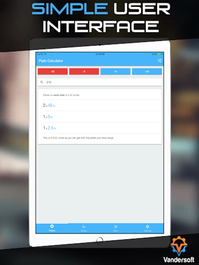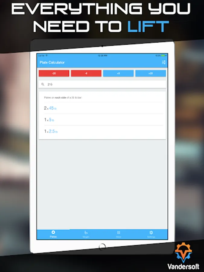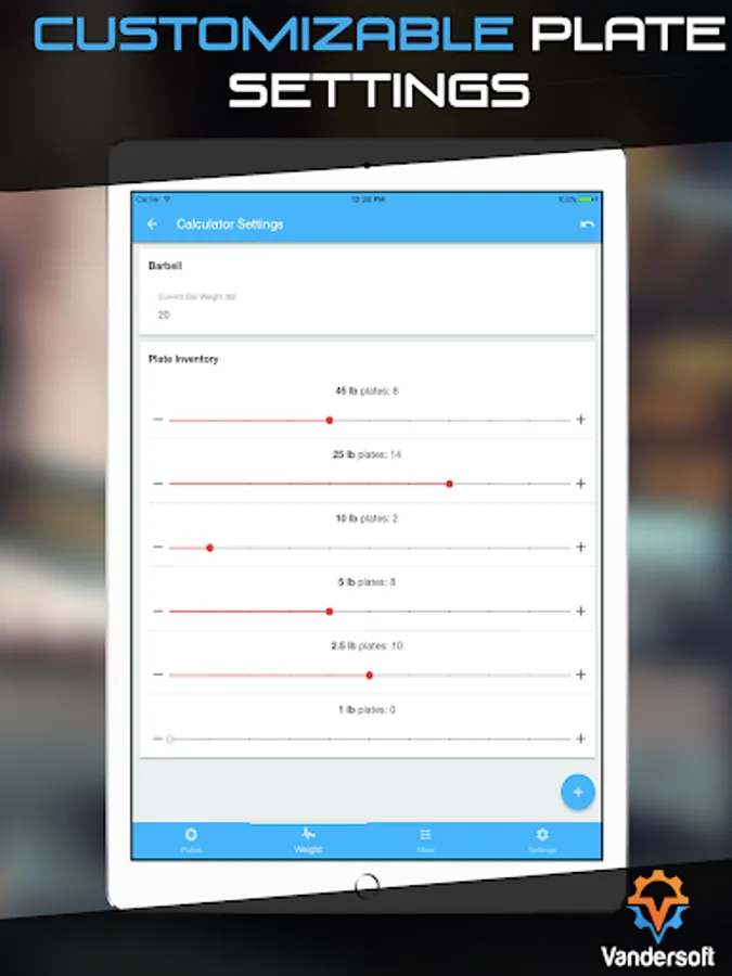 Save the plates and barbells you have available to you when you are lifting. The Plate Calculator only tells you to load the plates on your barbell that you have available based off what you've setup. Plate works with metric (kg) and standard (lb) barbells and plates.