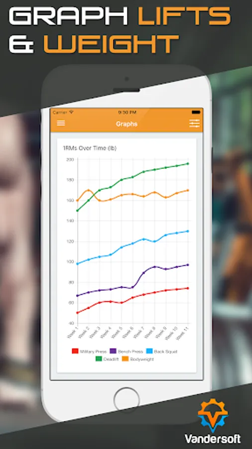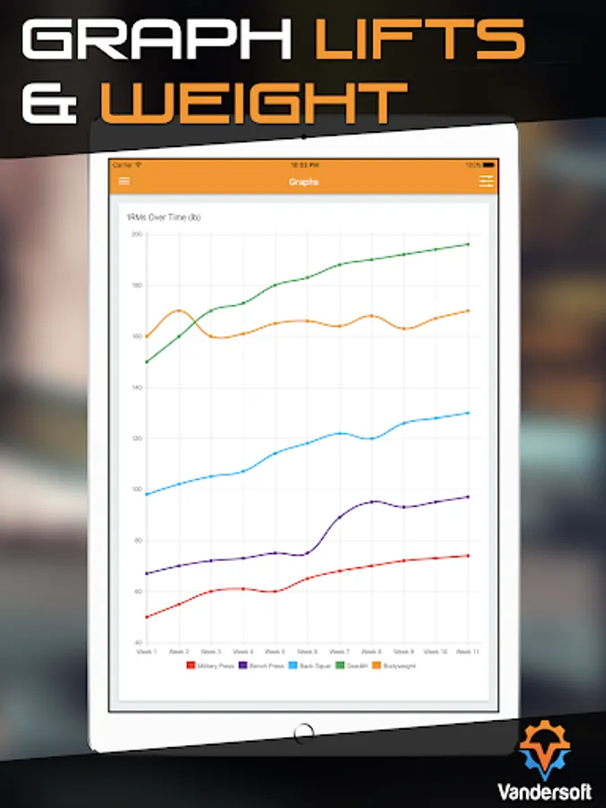 ✔ Graph your bodyweight and calculated one rep maxes over time