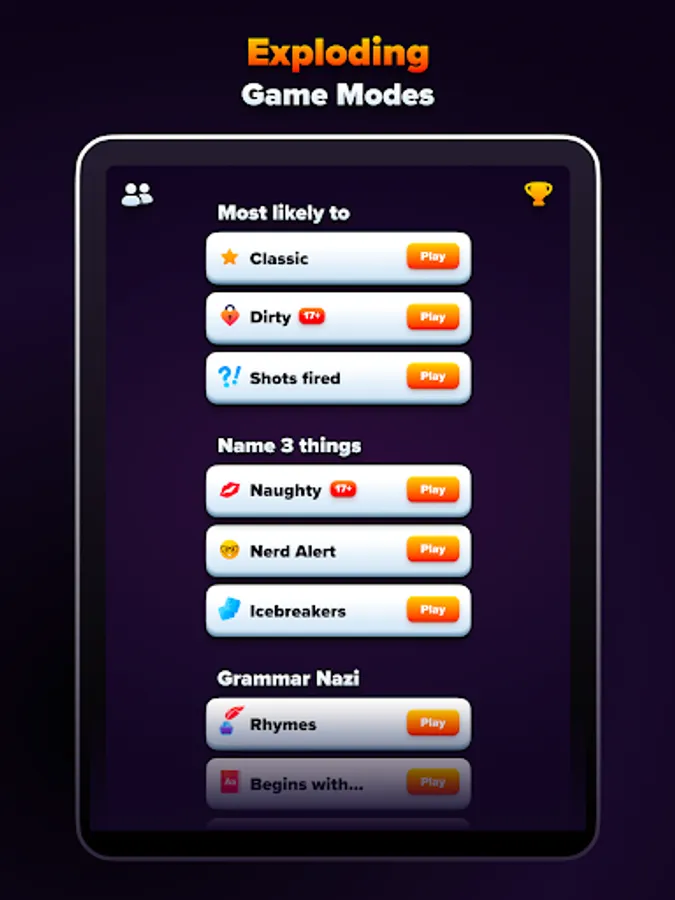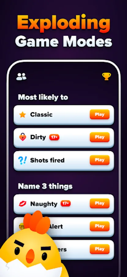 Exploding Chicken offers different game modes like Most Likely To, Name 3 Things, or Grammar Nazi.