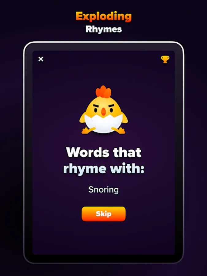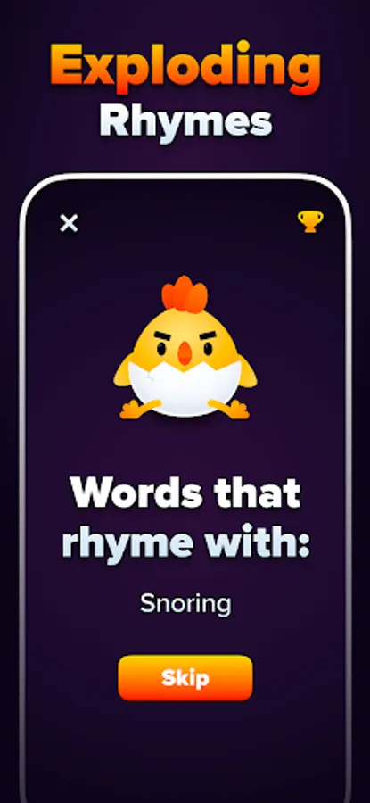The first player needs to find a word that rhymes with the word you and then hands over the phone to the next player. The next player needs to find a word that rhymes with the first player's word. The game continues until the chicken explodes. Using words twice is not allowed.